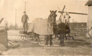 Last, but not least, is the photo of the Drury children’s father, Joseph H. Drury. Pictured here with his team of horses, his dray line cart, and the Chicago-Milwaukee-St.Paul train in the background, he is obviously on his way to work, as he travels toward the old Preston train depot.