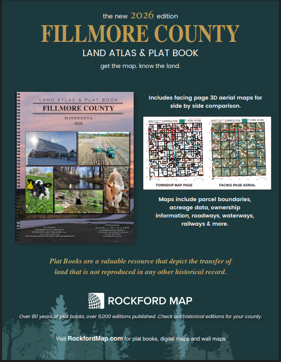 The 2026 Fillmore County Land Atlas and Plat Book is now available. This newest edition published by Rockford Map Publishers is available for purchase from Fillmore County Soil & Water Conservation District, 912 Houston Street NW, Preston, MN 55965.