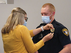 •There was an official pinning ceremony for Tim Melver, who was recently promoted to police sergeant. His wife Karla pinned the sergeant chevrons and badge on her husband’s uniform.