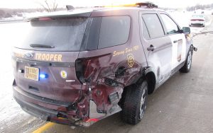We use our squad cars to secure crash scenes so those involved are protected from passing vehicles. This becomes extremely dangerous for troopers securing the crash scene – especially if the crash is blocking a lane of traffic on a slippery roadway.