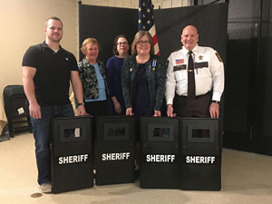The above photo shows the four ballistic shields that were donated, along with, left to right, Deputy Jessy Betts, DAR members Bonnie Kottschade, Patty Arndt, and Janel Kaster; and Sheriff Tom Kaase.