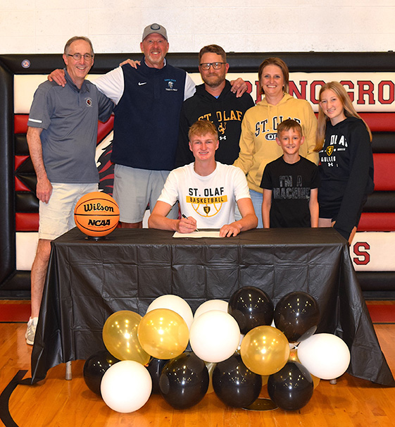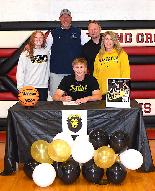 Spring Grove senior Elijah Solum has signed a basketball letter of intent with Gustavus Adolphus College (St. Peter, MN). Standing from left are sister Amelia Solum, Spring Grove coach Wade Grinde and parents Mike and Deanna Solum. Photo by Lee Epps