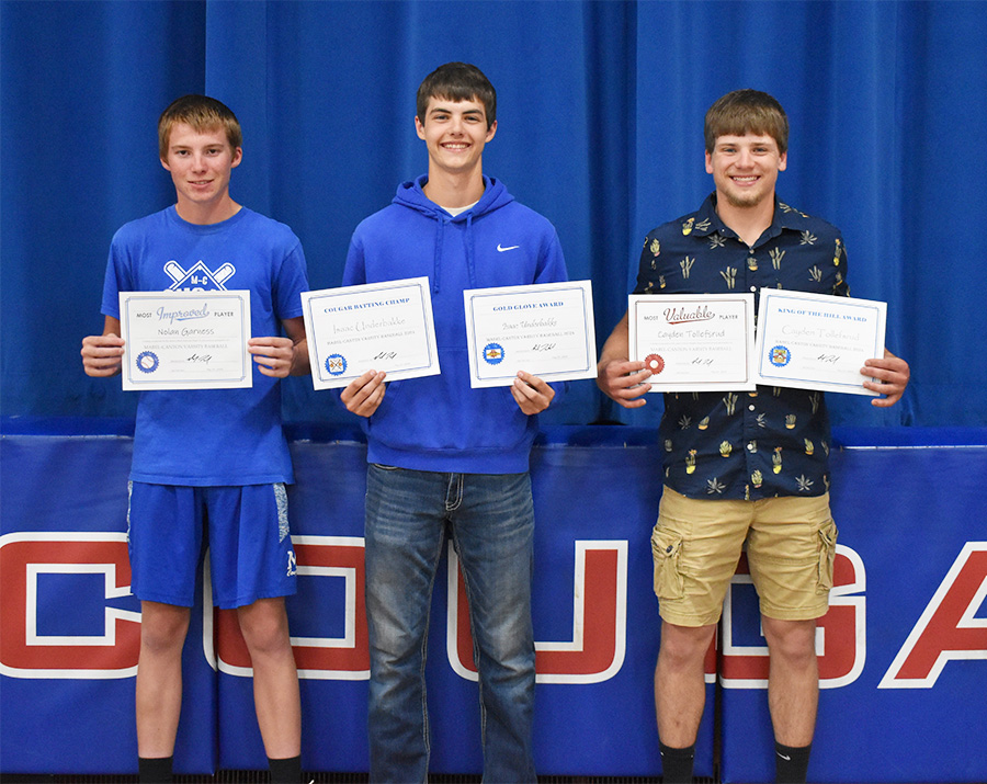 Mabel-Canton’s baseball team award winners for the 2024 season are Nolan Garness (Most Improved), Isaac Underbakke (Cougar Batting Champ, Gold Glove Award), and Cayden Tollefsrud (Most Valuable Player, King of the Hill). Photo by Heather Kleiboer