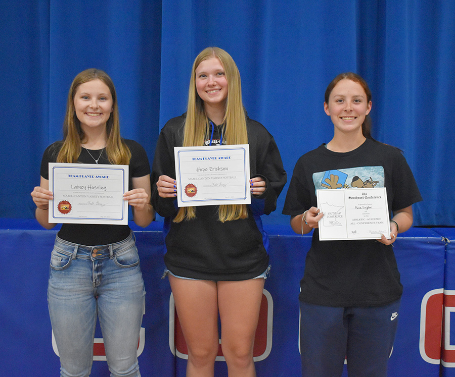 Mabel-Canton’s softball team award winner for the 2024 season. On the left are Lainey Hosting (Team Player Award), Hope Erickson (Team Player Award), and Kira Snyder (Hardest Worker). On the right are Adelia Gross (Most Improved) and Tylar Wenthold (Most Valuable Player). Photos by Heather Kleiboer