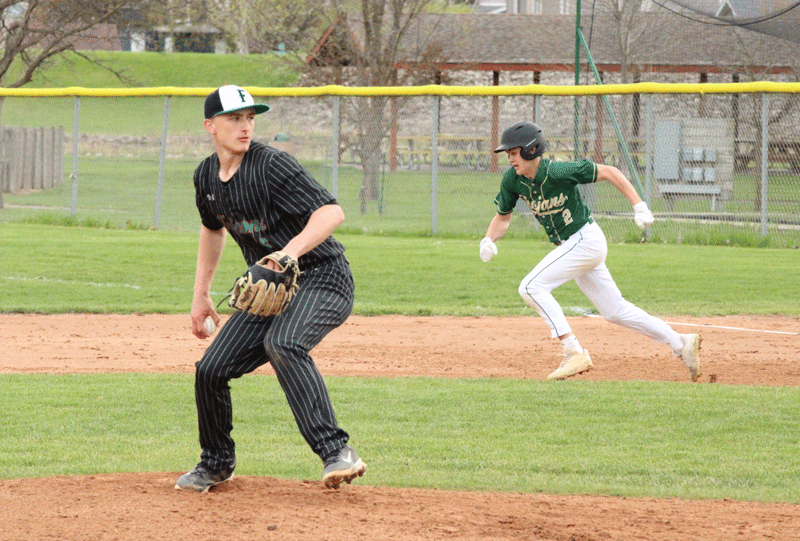 Rushford-Peterson’s Carson Johnson breaks for second base as FC/L’s Tyson Sprenger offers toward home in game two of the teams’ doubleheader. The Falcons took the two games 4-2 and 7-2. After one win a year ago, FC/L ended the week with a 7-6 record. Photo by Paul Trende
