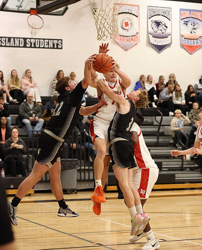 Things get physical between LeRoy-Ostrander’s Talan Lewison (middle) and Kingsland’s Kaleb Rainey (#23) and Cody Howard (#3). Lewison did the small things (14 rebounds, 7 assists, 4 blocks) and Reid Hungerholt scored a game-high 34 points in the Cardinals’ 67-41 SEC win.