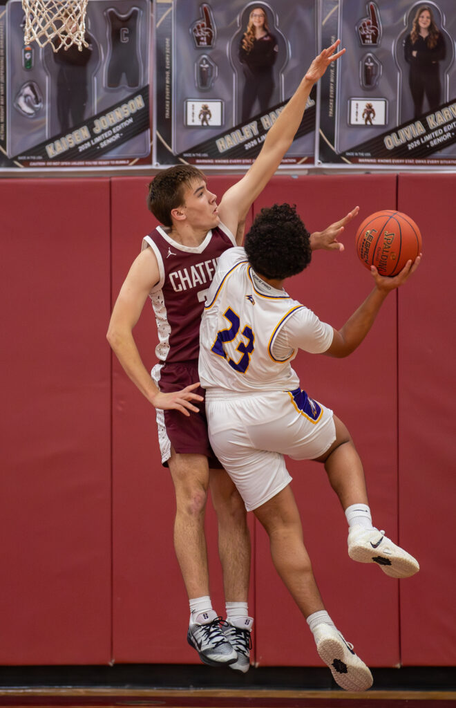 Chatfield’s Ross Stoehr defends the drive of Rochester-Lourdes’ Caleb Willaims in the Gophers’ 78-61 win where Stoehr went for 20 points and 11 rebounds.