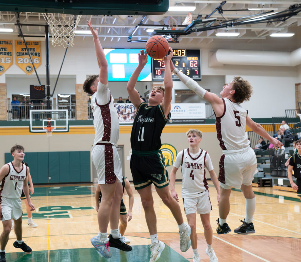 Rushford-Peterson’s Carson Johnson contends with Chatfield’s Brooks Lea (left) and Brandt McBroom (right) in the Trojans’ 79-67 TRC win. Johnson scored a team-best 18 points in the win.