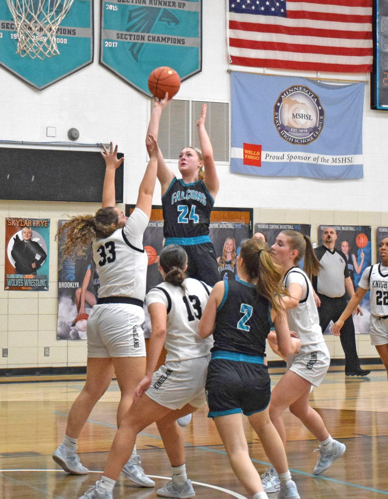 Faribault B.A. 49, Fillmore Central 62 (FC: A. Daniels 18 pts (12-13 FTs); Kyla Hellickson 13 pts (3-6 threes); Brooklyn Simon 8 pts; Haley O’Connor 6 pts (4-4 FTs), 6 rebs. FC hit 24 of 34 free throws (71%). They were one game removed from hitting 24 of 26 versus La Crescent/Hokah, leaving the Falcons 48 of 60 at the line in the two games (80%))