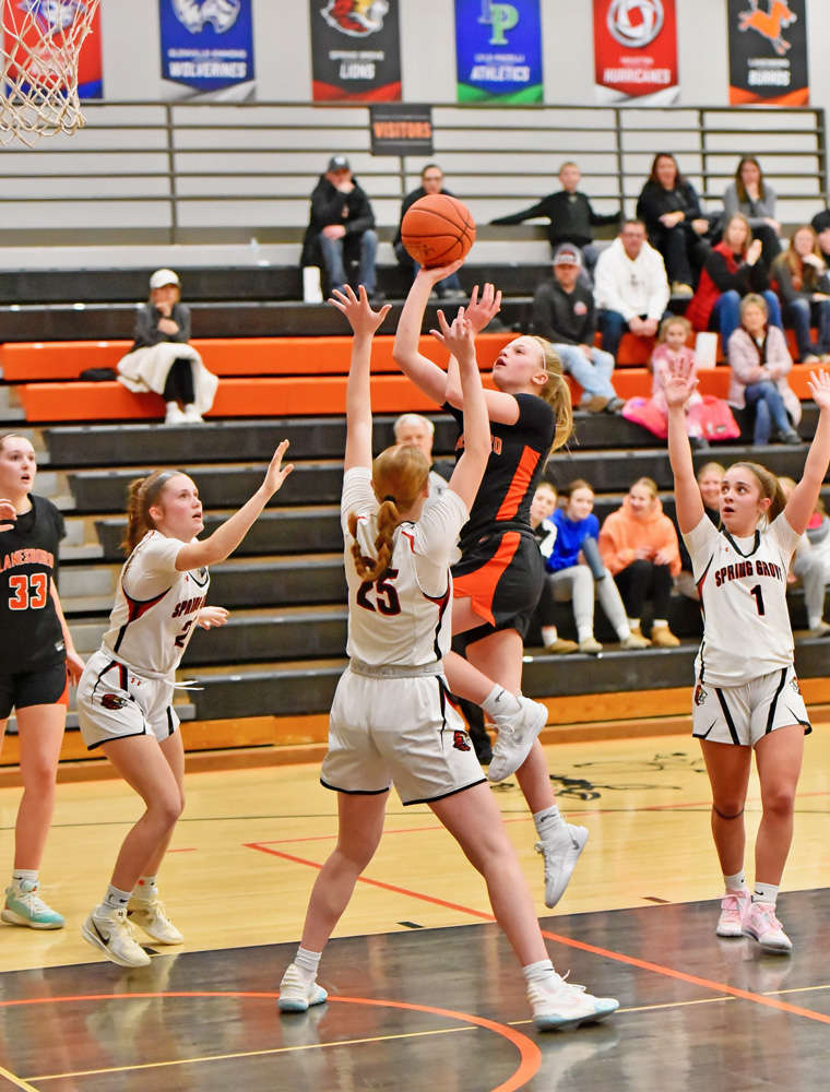 Decorah 51, Spring Grove 62 (SG: Siri Konkel 16 pts (5-6 FTs, 3-8 threes), 8 asts; Kinley Soiney 11 pts (3-9 threes), 6 rebs; Brinley Middendorf 9 pts, 5 rebs; Kylie Hammel 9 pts. The Lions had only eight turnovers and hit seven threes. The Vikings had 17 turnovers, zero threes. Spring Grove led at halftime, 29-20, and opened the second half with a 9-4 run)