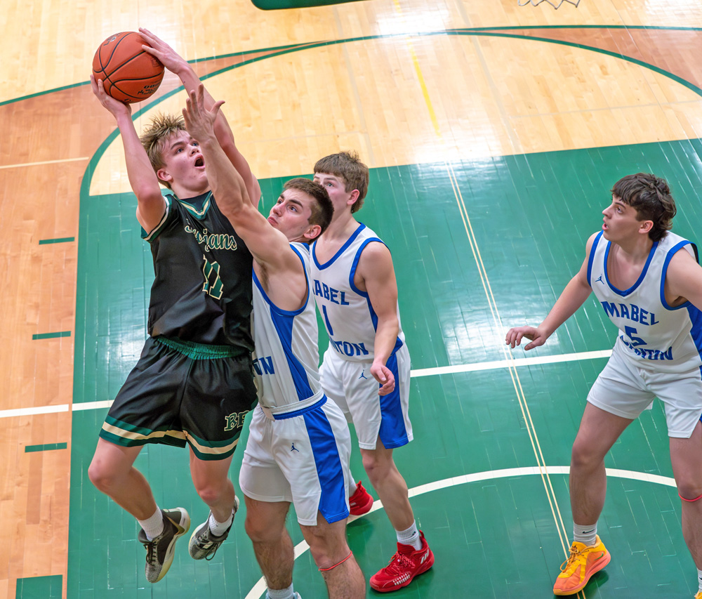 Rushford-Peterson’s Carson Johnson hangs for a shot over Mabel-Canton’s Tyler Larson in the teams’ 1A Round of 16 contest. The Trojans finished the first half on a 31-0 run to help post an 81-33 victory. Photo by Dawn Hauge