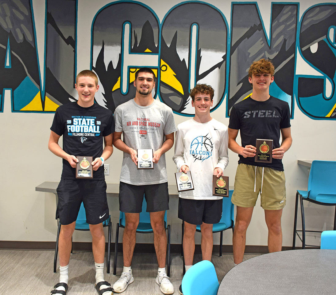 Fillmore Central boys basketball had its banquet. Individual team award winners were (L to R) Kyle Daniels (Co-Most Improved), Luke Hellickson (Offensive Player of the Year), Owen Schoepski (Iron Man – most charges taken, Co-Most Improved), and Greg Kennedy (Defensive Player of the Year).