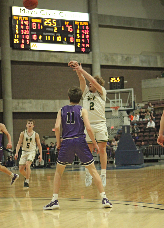 It seemed Rushford-Peterson (3-seed, 24-4) would perennially be stuck trailing by at least six points versus Goodhue (1-seed, 21-8) in the Section 1A title game. The Wildcats built their advantage much on the back of star guard Luke Roschen in the first half. After a tight first nine minutes or so, the junior hit a trio of mid-first-half threes to put the defending section champ Wildcats in control, up 25-16. From that point, Goodhue led by six to 13 points for a long period of the game. Roschen had a huge first half, scoring 25 points to propel Goodhue to a 40-30 halftime lead. R-P’s starting point guard Cayden Lea missed a good chunk of the first half getting a head wound attended to. The Trojans had to battle with their depth. Chris Drinkall’s group got 14 points from its bench in the stanza. In the second half, the Wildcat lead was at least eight until the final two minutes. R-P battled to the end, battling foul trouble to multiple players. A Jaxson Meldahl three with 1:09 left made it a 78-73 ball game. Goodhue then responded with a score. Meldahl, a big contributor off the bench in R-P’s semifinal win over Southland also, then authored a three-point play to make it 80-76 with 37.5 ticks left! After Goodhue converted one of two free throws, Meldahl scored his ninth point in less than a minute, hitting another three to make it 81-79 with 0:24 ticks left! The Trojans were just looking for a chance to literally steal the game. But Roschen then was fouled and hit both free throws with 20.8 seconds left, making it an 83-79 game. R-P did not score further and Goodhue won its second straight 1A title by 84-79 final. Roschen, a 6’2” junior, finished with 40 (pts), 6 (rebs), 5 (asts), and 4 (stls). He hit 5 of 10 threes. Freshman Alex Loos added 20 (pts) and 6 (rebs). Owen Roschen chipped in 12 (pts) and 6 (asts), scoring 10 in the second half. The Wildcats had five guys score. R-P had nine do so. Will LaFleur led the way with 22 points, 6 rebounds, and 4 assists. He had 11 points in each half. Meldahl scored 17 points (3-4 threes) off the Trojan bench. Lea, after not scoring in the first half, finished with 12 points. Carson Johnson added 7 (pts), 7 (rebs), and 5 (asts). All told, R-P had 26 bench points, Goodhue six. The Wildcats were plus-three at the free throw line, 19 of 26 (73%) to R-P’s 16 of 21 (76%). They were also much better from two-point range, making 22 of 35 (63%) to R-P’s 15 of 31 (48%). R-P was plus-12 from deep, hitting 11 of 32 threes (34%) to Goodhue’s 7 of 21 (33%). Nine of those makes came in the second half, when R-P out-scored the Wildcats 49-44. But Goodhue shot better overall, 29 of 56 (53%) to R-P’s 26 of 63 (41%). The Trojans worked hard, harvesting 19 offensive rebounds to Goodhue’s 8, but only won second-chance-points 15 to 10. The young Trojans’ season comes to an end at 24-5. It was their first loss to a Class A team. Caden Johnson is their lone senior. A promising next year will be somewhat dampened by the rumor and likelihood R-P could move to Class AA.