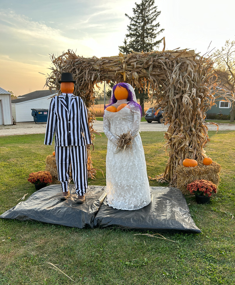While the vehicles and animals can be set up in the daylight, Mitch and Nicole quickly learned they were better off to perfect the people at night under the cover of darkness – people REALLY stared as they drove by during the day and saw the couple adjusting parts of the pumpkin people! Now Mitch wears a headlamp and quickly shuts it off when they see someone coming as they adjust details.
