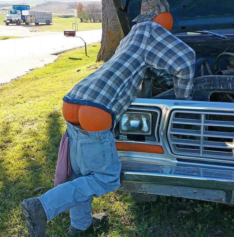 One of the earliest creations was of a man bent over a pickup truck’s open hood. At the time, Mitch worked at a bus company. Other guys from the company kept calling him up, asking him why he was at home and if he had truck trouble. He had dressed the character in his own old clothes and people passing by apparently thought it was him. Mitch chuckled that he felt a need to check out his butt and see if it really was orange. Why? Because the bent over man had a couple of pumpkins peeking out of his jeans to portray his tush!