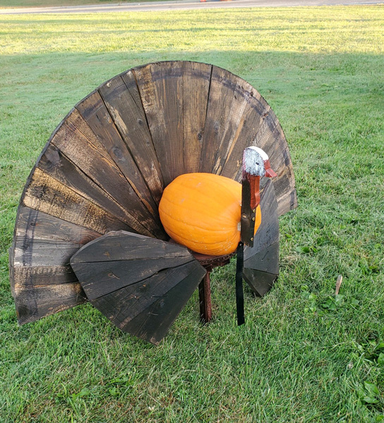 A couple from southern Iowa makes a road trip to Bratsberg in mid-October mostly to see the new display. People look forward to seeing it each year and stop in all day to take a picture and check out the display. Mitch chuckled, “Little kids get a big kick out of the pumpkin butts!”