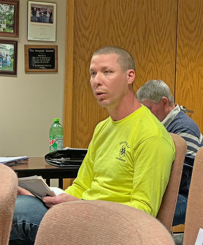 Brownsville Volunteer firefighter, Brandon Frank, answers the council’s questions regarding the urgency of funds to purchase SCBA cylinders for the department’s safety and health. Photo by Charlene Corson Selbee