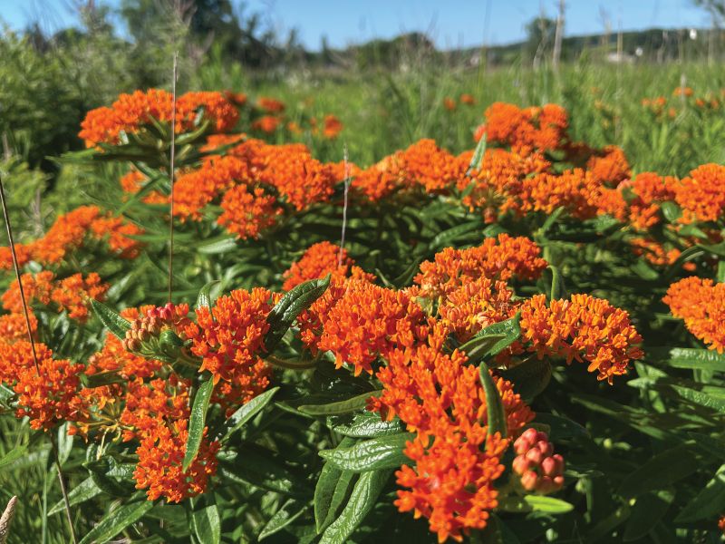While milkweed is essential, it is only one piece of a larger habitat puzzle. Pollinators require flowering plants that provide nectar and pollen from early spring through late fall. In early spring, blooming plants, including large-flowered beardtongue (Penstemon grandiflorus), foxglove beardtongue (Penstemon digitalis) and golden alexanders (Zizia spp.) support native bees and other insects emerging from winter dormancy. Summer flowers coincide with peak pollinator activity, while fall-blooming plants such as goldenrods (Solidago spp.) and New England aster (Symphyotrichum novae-angliae) are especially important for monarchs preparing for migration and for bees storing energy before winter.
