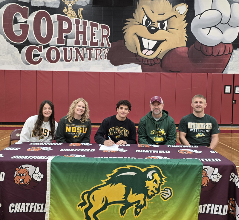 Chatfield’s Javier Berg recently signed a letter of intent to wrestle collegiately at North Dakota State. Berg is flanked by his sister Chloe, mom Elizabeth Fugelstad, step-dad Derek Fugelstad, and Chatfield head wrestling coach Matt Mauseth. Berg has been a state champion (106) and state runner-up (114) the past two years.”