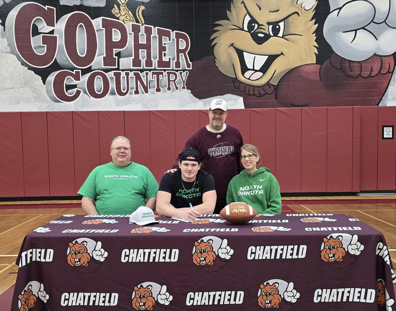Chatfield’s Ethan Cole recently signed a letter of intent to play college football at Division I North Dakota. Cole is flanked by his parents Bob and Deb, Gopher head coach Jeff Johnson. Cole is a two-time All-Southeast White lineman and Co-Lineman of the Year this season.