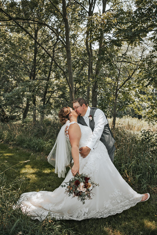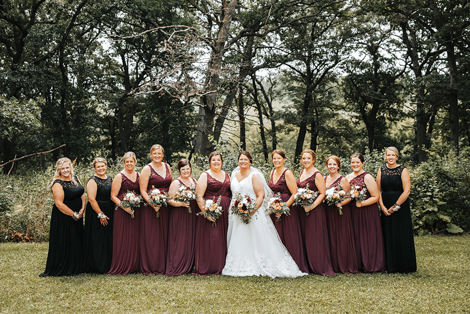 The bride walked down the aisle to her waiting groom in a stunning white sleeveless princess-style dress accented with lace, complemented by a mid-length veil. Her attendants looked equally beautiful in sleeveless wine-colored dresses, all of which were purchased from David’s Bridal in Rochester, Minn. For their hair, Chelsey chose Tamiko’s Salon in Caledonia, while Mary Ann’s Floral and Gifts, also in Caledonia, were responsible for the flowers. The wedding’s color scheme featured elegant shades of wine, tan and green.