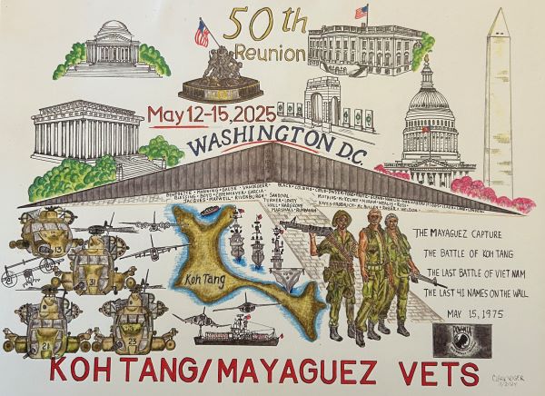 Wiger has drawn the artwork for the coin that will be minted for the 50th reunion; the Koh Tang veterans carry these coins in their pockets in memory of Koh Tang. He also has drawn a detailed collage for the reunion which includes sketches of the Knife 13, 31, 21 and 23 helicopters, the Holt, Wilson and Coral Sea ships, Koh Tang Island, the Mayaguez, the POW MIA flag, the Vietnam wall as well as other D.C. buildings. The last 41 names on the wall are each listed on the drawing.
