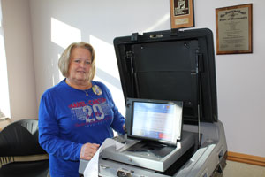 Sherida Newgard, who serves as the Absentee Voter Clerk for Fillmore County, Minn., demonstrated how the equipment worked as it processed ballots. She has worked with the count