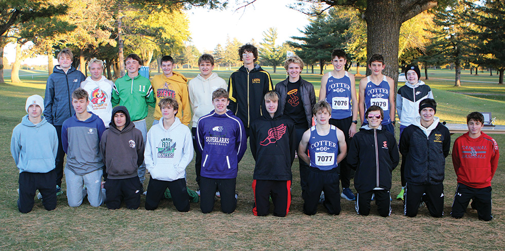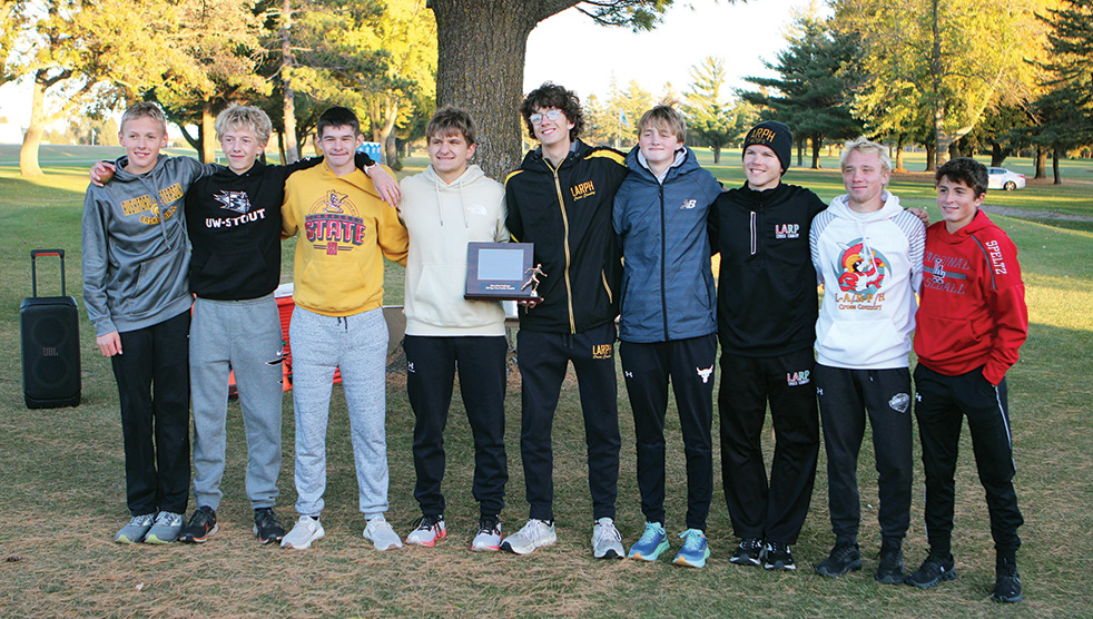 LARPH boys cross country won its second straight TRC Meet team title by topping rival Cotter/Hope Lutheran 37 to 40. Coached by Matt Kingsbury, team members above (left to right) are Will Jewison, Hunter Rislov, Brennan Kunst, Trey Hegland, Aaron Ploetz, Isaac Ramussen, Matthew Sprague, Wyatt Kreidermacher, and Grayson Speltz. Photo by Paul Trende