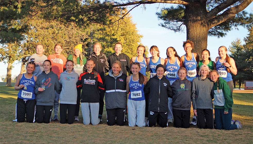 Finishing top 21 and making All-conference in the Three Rivers for cross country are the above female runners. Included in the back row are Chatfield’s Charlotte Oeltjen, LARPH’s Caitlin Bauer, LFC’s Lillyan Kiehne, and Chatfield’s Lexi Kivimagi (first, second, fourth, and fifth from left respectively). Included in the front row are LFC’s Grace Kingsley, Charity Kingsley, GMLOS’ Naomi Warmka, Kingsland’s Kylie Meyer, and LARPH’s Vada Larson (second, third, fifth, seventh, and eighth from left respectively). Photo by Paul Trende
