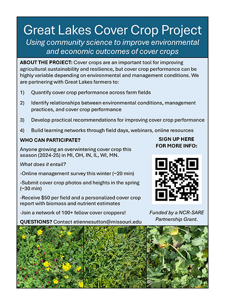 We are looking for farmers who have grown a cover crop for the 2024-25 season! A community science effort is bringing together farmers from across the upper Midwest to build a regional database of cover crop performance, which then allows for identifying what cover crops and management practices work best across different farming conditions. Partnering farmers collect cover crop photos and height measurements from their fields in the spring, and in return receive a personalized report with cover crop biomass and nutrient estimates, along with $50 per field for up to three fields. Anyone growing overwintering cover crops this season in Michigan, Ohio, Indiana, Illinois, Wisconsin, or Minnesota is eligible.