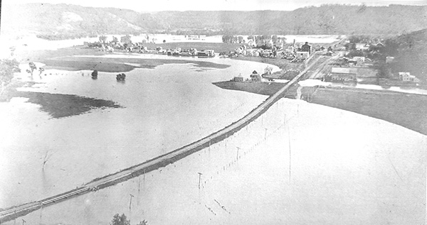 The towns along the Root River felt the wrath of flood waters many years. The houses in Peterson from the bridge to where the current museum stands were often flooded, the business downtown and part of the city that was on higher ground mostly remained dry. In a picture taken in 1901 from the bluff north of Peterson, the only land above water was the railroad tracks from Rushford, the business district and the bridge across the Root River.