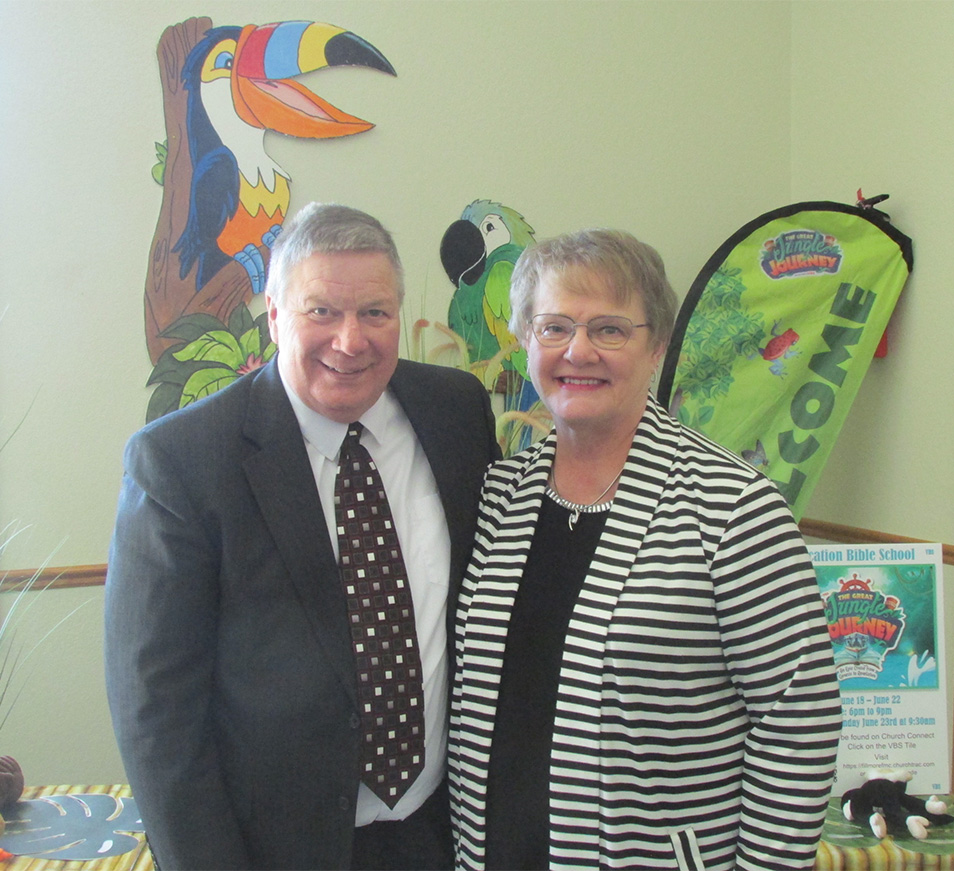 Pastor Larry Day and his wife Karen in front of the Vacation Bible School display at Fillmore Free Methodist Church. Photo by Sara York
