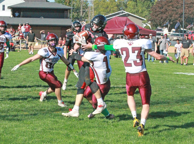 Spring Grove’s Brandon Jahnke makes the congested touchdown catch with Mountain Lake defenders Evan Karschnik (#1), Layne Wall (#23) and an unknown player defending. The #7 in 9-Man Lions (4-0, 5-0) led 21-0 at half and then held off the Wolverines 21-12 in a battle of unbeatens. Photo by Paul Trende