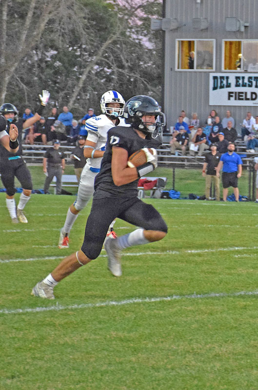 Fillmore Central’s Kane Larson runs in the open for one of three rushing TD for the junior in the Falcons 42-14 win over Cotter for homecoming. FC had a punt return TD and kickoff return TD in improving to 4-1 on the year. Photo by Deb Finseth