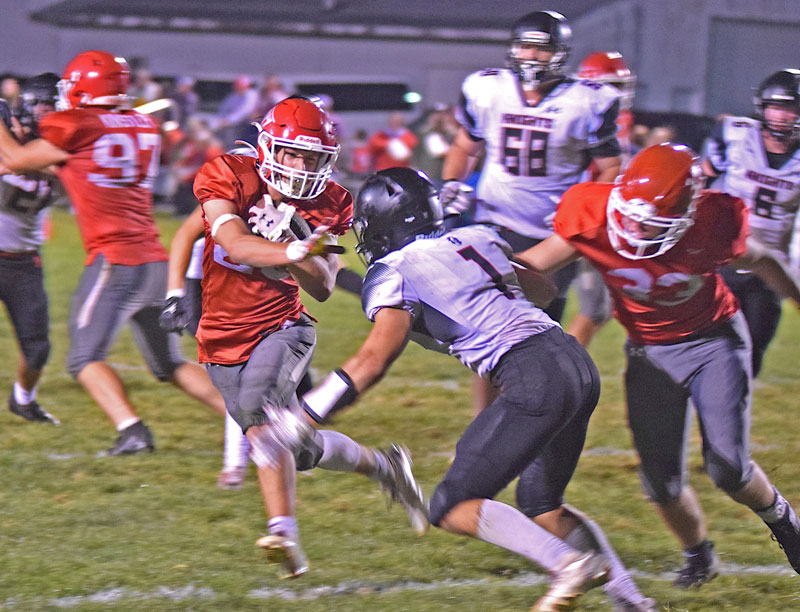 Houston running back Lee Klunder takes on A-C/G-E tackler Nicholas Korman in the teams’ South-East matchup. Hurricane Aden Kulas is also shown. Klunder and stepbrother Maddox Rodriguez each went for over 100 yards and combined for five rushing TDs in the Hurricanes’ 42-28 win. Photo by Lee Epps