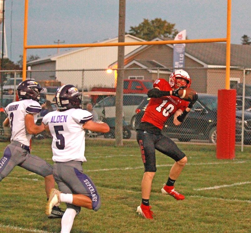 LeRoy-Ostrander/Lyle/Pacelli’s Reid Hungerholt secures a 37-yard TD pass from brother Camden, behind Grand Meadow defenders Blake Hubbard and Teague Alden, in the Cardinals 54-12 win. L-O/L/P remained unbeaten (4-0, 5-0) with the victory. Photo by Paul Trende