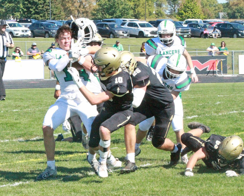 Nine-man seventh-ranked Spring Grove scored all the first-half points, and visiting Mountain Lake Area scored all the points in the second half. But the East Sub-District Lions (4-0, 5-0) held on to win the battle of football unbeatens, 21-12, over the visiting West Sub-District Wolverines (4-0, 4-1). After punting twice, SG scored on three straight possessions, traveling 85, 53 and 73 yards, to lead 21-0 at halftime. Two plays after intermission, Bryce Berns intercepted a Mountain Lake pass, but the Wolverines would not be denied again, controlling the second-half clock with 13 and 16-play scoring marches covering 65 and 70 yards. Both MLA touchdowns came on fourth down. The Wolverines converted four of five fourth-down plays total, including a fake-punt pass for 27 yards (a momentum shifter) on their first TD drive. Mountain Lake (4-0, 4-1) failed on both extra-points passes, the first broken up by Lion Troy Reinhardt. The second failed PAT required the Wolverines to score twice with 5:13 remaining. The Lions then resurrected their offense to run out the clock with an eight-play possession before time expired. Overall, Spring Grove outgained the visitors, 271 to 206 and won the turnover battle, 2 to 0. Lion quarterback Bryce Berns rushed for 129 yards, including a 39-yard scamper that was the longest play of the day, setting up his 15-yard TD scramble, just 33 seconds before halftime (SG led 21-0). Berns (8 of 16) threw for 86 yards, including a 2-yard TD toss to tight end Brandon Jahnke – the most amazing play of the day. Berns had been spun completely around while in the grasp of a Wolverine pass rusher. Meanwhile, Jahnke had slipped to the turf in the end zone but got up to take a few steps before leaping above a Wolverine defender to snare the 6-point pass (SG led 7 0). The other Lion TD was also for short yardage (3 yards) but also memorable. Dash Ranzenberger (12 carries, 42 yards) took the handoff and was seemingly buried by three tacklers before he spun away and plunged across the goal line. (SG led 13-0). Zach Brumm snared a career-high six receptions for 51 yards. Ben Udstuen caught the only deep aerial for 33-yards. Udstuen also caught a leaping two-point conversion pass and kicked an extra-point. Evan Karschnik, the West Sub-District scoring leader, scored on a three-yard run but was otherwise limited to only 39 yards on nine carries. Quarterback Jake Evers (11-17, 99 yards passing) threw a 7-yard TD pass to Maxton Fast, but Evers was also intercepted twice (Brumm and Berns). The Lions won last year’s season opener at Mountain Lake, 28-7, and walloped the Wolverines, 40-18, in the 2018 state championship game. SG (4-0, 5-0) and LeRoy-Ostrander/Lyle/Pacelli (4-0, 5-0) lead the South-East. They do not play each other.