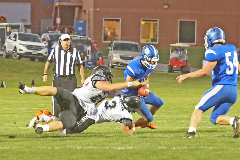 Kingsland’s Ira Schmidt and Bently Wiersma (#3) combined to bring down Mabel-Canton quarterback Isaac Underbakke. In a battle of 3-1 teams, with backup quarterback Caden Reiter at the helm, the Knights won their fourth straight, a 33-6. Photo by Christine Vreeman