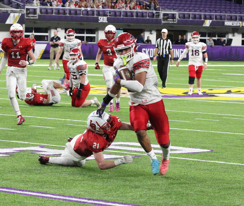 For three-plus quarters, it was literally back-and-forth. In a state semifinal contest at U.S. Bank Stadium, #5 LeRoy-Ostran-der/Lyle/Pacelli (South 1-seed, Section 1 Champ, 12-0) and #3 Fertile-Beltrami (North 2-seed, Section 6 Champ, 11-0) matched each other score for score. But then in the final 2-plus minutes of the third quarter, and the opening seconds of the fourth quarter, the Falcons ripped to 22 unanswered points. And that was all she wrote. Or moreover, that was all she Wright. As in, Falcon senior running back Isaiah Wright, who had a game for the ages. The first 10 scores of the game were all posted in alternating fashion. L-O/L/P quarterback Camden Hungerholt mostly used his arm in the first half to inflict damage. He had the Cardinals first score, a 43-yard first quarter TD run (done after tiptoeing the sideline), but it was his only rushing TD of the game. Hungerholt threw deep a lot, but hooked up with brother Reid Hungerholt for scoring strikes of 36 and 66 yards in the first half, plus a 45-yard to Ryder Stern. It came in the waning seconds of the second quarter, as the senior tight end was open down the middle, ran into congestion, broke a tackle, and then broke free. Said score put L-O/L/P up 27-22 at intermission. Meanwhile, Fertile-Beltrami’s Wright ran for scores of 46, 59 and 13 yards. The 6’0” 200-pound senior had 181 yards rushing at the half and he was not nearly done. After stopping L-O/L/P’s first drive of the second half, Wright ripped another lengthy run, a 43-yard score, to put the Falcons ahead 30-27. The Cardinals answered immediately, going 59 yards in 10 plays. Tyson Stevens’ 3-yard plunge capped the series and gave Trevor Carrier’s squad the lead at 33-30 with 4:30 left in the third. It looked as though the team with the ball last might be the victor, or the first team with a key turnover would be the loser. But then a six-minute stretch of football that will haunt the Cardinals. F-B got a big 64-yard pass from QB Easton Petry to tight end Drew Gullickson to reach the L-O/L/P red zone. Wright capped the series with a 6-yard TD run, making it 38-33 F-B with 2:18 left in the third. The Cardinals’ next series was stopped on 4th down near midfield. Wright then ripped a 56-yard TD run on the Falcons first play, making it 44-33 with 0:45 left in the third. Wright then intercepted C-Hungerholt two offensive plays later. Three plays after that, he burst 38 yards to pay dirt for his seventh TD and third in four-minute span. And F-B added a two-point conversion on two of the three unanswered scores. The scoreboard suddenly read 52-33 with 10:32 to go in the game. Another interception led to another F-B score. Led by Wright, who ran for 363 yards and seven TDs on 24 carries, Fertile-Beltrami notched a 60-33 victory. The Falcons as a team ran for 474 of their 551 total yards. Jonah Harstad chipped in 15 carries for 75 yards in their last score. Their 64-yard pass play accounted for most of their 77 yards through the air. Hungerholt, a Mr. Football finalist, led L-O/L/P (12-29, 238 yards, 3 TDs, 2 INTs passing; 23-152, TD rushing). But he came in averaging over 200 rushing yards per game and the sole rushing score matched a season low each time done in blowouts of Westbrook-Walnut Grove and Lanesboro. Reid Hungerholt (3-117, 2 TDs) had all his receptions in the first half. Carter Sweeney led L-O/L/P with five receptions totaling 49 yards. But after passing for 187 yards and 3 TDs in the first half, the Cardinals threw for 51 yards, 0 TDs, and two interceptions after halftime. Stevens chipped in some offense (9-24, TD rushing; 2-20 receiving) while notching a team-high 13 tackles. C-Hungerholt and Stern added 10 stops each. L-O/L/P had just one tackle for a loss. L-O/L/P gave up an easy season high in points while scoring a season low. The Cardinals’ excellent co-South-East and 9-Man Section 1 champs season ends in the state semifinals with a 12-1 record. Coach Carrier lamented it being the last game for his eight seniors C-Hungerholt, Sweeney, Stevens, Stern, Gabe Nagel, Dylan Christianson, Landon Meyer, and Joseph Anderson; “Losing is not fun … … but losing seniors is more difficult. I have been in LeRoy now for 12 years and these guys were in kindergarten my first year. So, I have dealt with these guys my whole life there. It’ll be tough to say goodbye to these guys. If my son is half the kids these guys are, I will be one proud dad.” In regards to F-B’s Wright, “If somebody is not recruiting him by now, I endorse him. You might want to get on that… get that kid on a college team.” He continued, “This is tough. This is really tough for us. But credit to them (Fertile-Beltrami). They are a very good football team.”