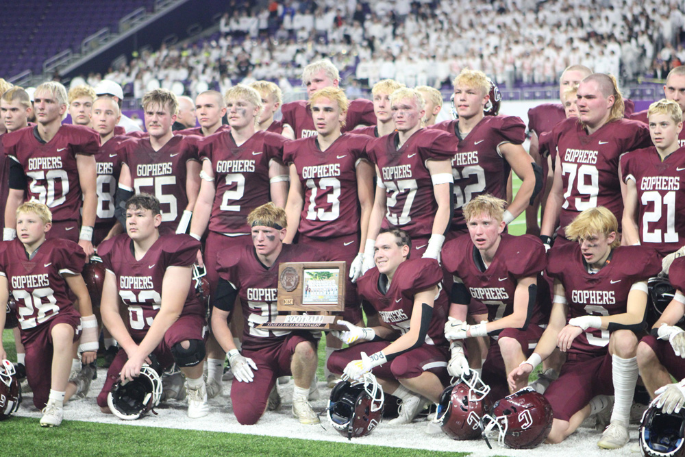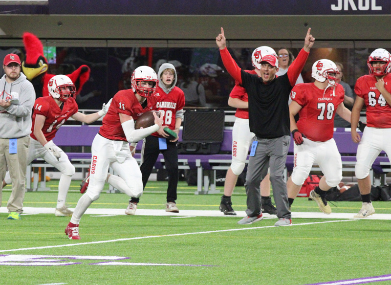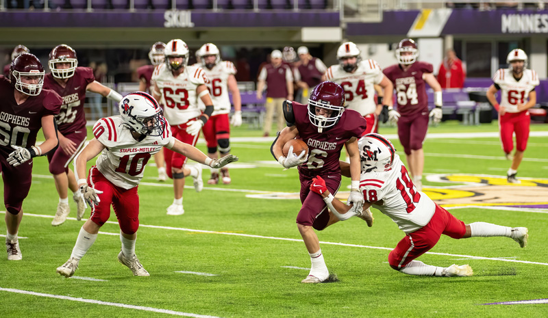 Staples-Motley (North 3-seed, Section 6AA Champion, 11-0) stormed out the gates versus Chatfield (South 1-seed, Section 1AA Champion, 11-0) and the Gophers could never completely recover in a state semifinal contest at U.S. Bank Stadium. The Cardinals’ offense was near unstoppable in the first half, piling up 287 yards of offense. The only time they were stopped (save the last possession of the half), was by a fumble on the Gopher goal line. S-M jumped out to a 16-0 first quarter lead, sandwiching a 12-play, 58-yard sequence, and a 4-play 39-yard sequence, around a Gopher failed 4th down conversion at their own 39-yard line. The Cardinals’ first drive converted two 4th downs including Alex Schultz’s 29-yard contested reception on 4th and 13 to the two-yard line. Colbe Tappe than had a 1-yard TD run. The conversion pass also succeeded. S-M’s second drive, on a short field, was capped by 7-yard Eli Rutten TD pass to Conner Kuhns. The Cardinals again converted. With 3:41 left in the first, Chatfield trailed 16-0 and they fought from underneath the rest of the game. The teams then exchanged scores the next five series. Ben Carrier got Chatfield on the board with a 26-yard TD run following a six-play, 63-yard drive (16-6 S-M). S-M replied with a 7-play, 63-yard drive, capped by a Rutten to Tappe 14-yard scoring play on 4th down (22-6). The Cardinals were three of three on fourth down in the half. The Gophers then went 61-yards in seven plays. Carson Rowland hit Tobin McMahon for 21-yard pitch and catch (22-14). S-M answered in just three plays, as Tappe ripped a 51-yard TD run (30-14). Chatfield answered with a two-play drive, as Rowland hit Carrier for a 54-yard TD reception (30-22). S-M then had their sole unsuccessful drive of the half, making the Gopher 1-yard-line before Rutten fumbled and McMahon recovered (a play that was originally called down, but changed by replay). Chatfield then had one of four drives to try to tie the game. As the half waned, they got a couple chunk plays to make the Staples-Motley 14-yard line. But a sack, and then a pressure-induced interception, ended the series. A wild first half that saw the teams combine for over 500 yards total offense and seven total TDs ended with the Gophers trailing 30-22. And after all those first half points, only eight were scored after intermission. Jeff Johnson’s crew had three third quarter possessions to try to tie the game, trailing 30-22. The latter two ended in interceptions, as the teams combined for four third quarter turnovers. The second pick occurred at the Gopher 13. Three plays later, the Cardinals retook a multi-possession lead courtesy of a Tappe 1-yard run. It was the only TD of the second half, and it gave the Cardinals a 36-22 lead. Chatfield’s only points of the second half came on a 4th quarter safety when a S-M punt snap went through the end zone. The Gophers subsequently made the S-M 9-yard line, but the series then ended on downs with 4:27 left, effectively ending the game. Staples-Motley moved on to the state finals courtesy of a 36-24 victory. After 252 yards in the first half, Chatfield had 69 in the second half. After 287 yards in the first half, S-M had 126 in the second half. Carrier (11-104, TD rushing; 2-85, TD receiving) led the Gophers. Rowland (8-17, 171 yards, 2 TDs, 2 INTs passing) had a big first half throwing the ball (6-9, 152 yards, 2 TDS, INT), but was less successful after halftime (2-8, 19 yards, INT). Kaisen Johnson (4-52 receiving) and McMahon (2-34, TD receiving) joined Carrier in catching passes for the Gophers. McMahon added an interception and a fumble recovery. Tappe (25-171, 3 TDs rushing, 14-yard TD reception) led S-M with his consistent rushing presence. Schultz, a 6’3” junior wide receiver, was S-M’s preferred target (5-126 receiving), all in the first half. Rutten (13-19, 195 yards, 2 TDs, INT passing), like Rowland, had most of his success in the first half (10-14, 168 yards, 2 TDs) versus the second (3-5, 27 yards, INT). Chatfield had three turnovers in the game. They entered with five total on the season with only one over the previous five games. The teams also met in last year’s state wrestling final, a dominating 47-7 Gopher win. Each team had multiple combatants from that involved including Tappe versus Rowland, which happened in both the team wrestling finals (a 3-2 Rowland win) and the 152-pound individual final (5-3 Rowland win). Chatfield’s excellent season thus ends at 11-1. It was their 11th overall state appearance and fourth under Jeff Johnson. It was the first time a state trip did not end in the state finals under Johnson. His state record is 9-2. Chatfield will graduate an excellent senior class including Carrier, Rowland, McMahon, Ethan Cole, Jake Stevens, Ayden Miner, Westin Nolte, Ethan Eickhoff, Cole Ramaker, Chase Johnston, Gage Anderson, Wyatt Jacobson, Masyn Kreter, Keegan Patten, Thane Schild, Carson VanDeWalker, and Caleb Austin. S-M ended the season ranked #10, Chatfield #2. The Cardinals thus can boast to beating #1 Barnesville and the #2 Gophers at the state level. They will face #3 Jackson County Central for the title. Coach Jeff Johnson on Staples-Motley’s line play (negating the Gophers’); “We have been very good up front all year. We have got some pretty salty kids on the offensive and defensive line. Yeah, (Staples-Motley) did a good job taking some of our lineman out on offense … … they held their own. There is a reason why they are here. We just did not come up with as many big plays as they did.” In regards to his team, “Probably the most coachable, unselfish group I have ever had …. … these kids would do anything for the team. They are battlers.” On Staples-Motley’s offense; “They got a lot of moving parts. There are running a lot of motions. For the most part, our kids stayed with it. Just a couple of jump balls that did not go our way. Nobody was extremely wide open. We had decent coverage on