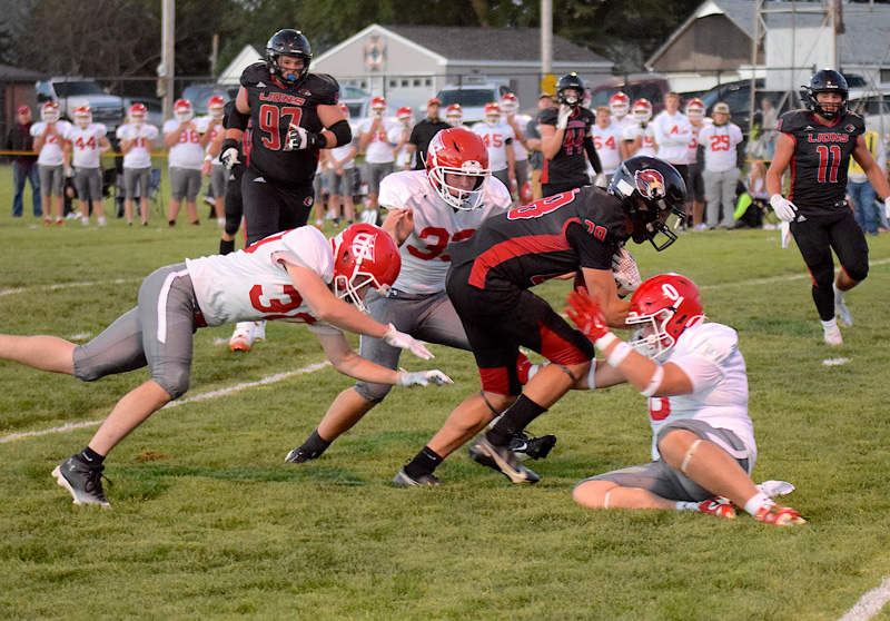 Houston tacklers (from left), Rysen Gorman, Aden Kulas and Axel Vix converge on Spring Grove receiver Zach Brumm. The Lions would score on the next play to take a 13-0, second-quarter lead, part of SG’s 35-14 home win. Photo by Lee Epps