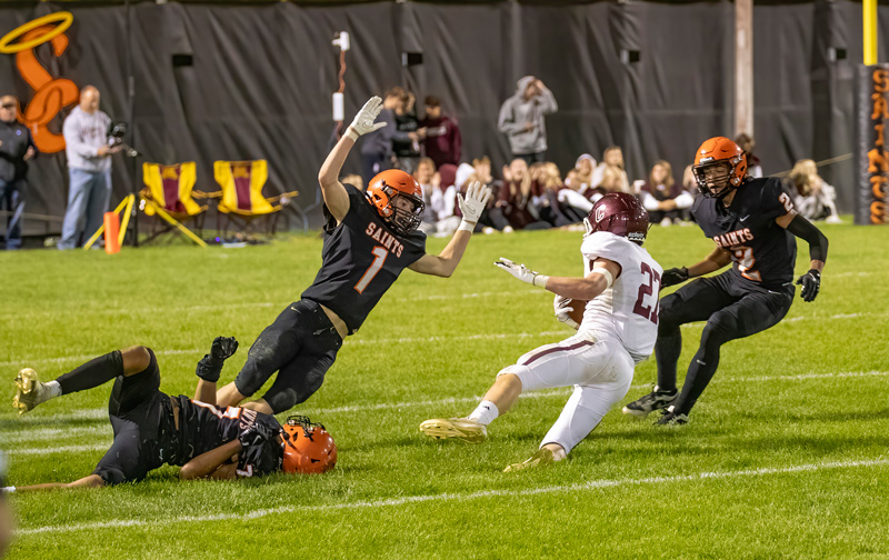 Chatfield’s Ethan Eickhoff makes the catch in the red zone surrounded by. St. Charles defenders in the teams’ week two White matchup. Chatfield (2-0) used its big, athletic offensive line to beat the Saints via 46-7 final, as the Gophers ran for 347 yards on 34 carries. Photo by Leif Ericksson