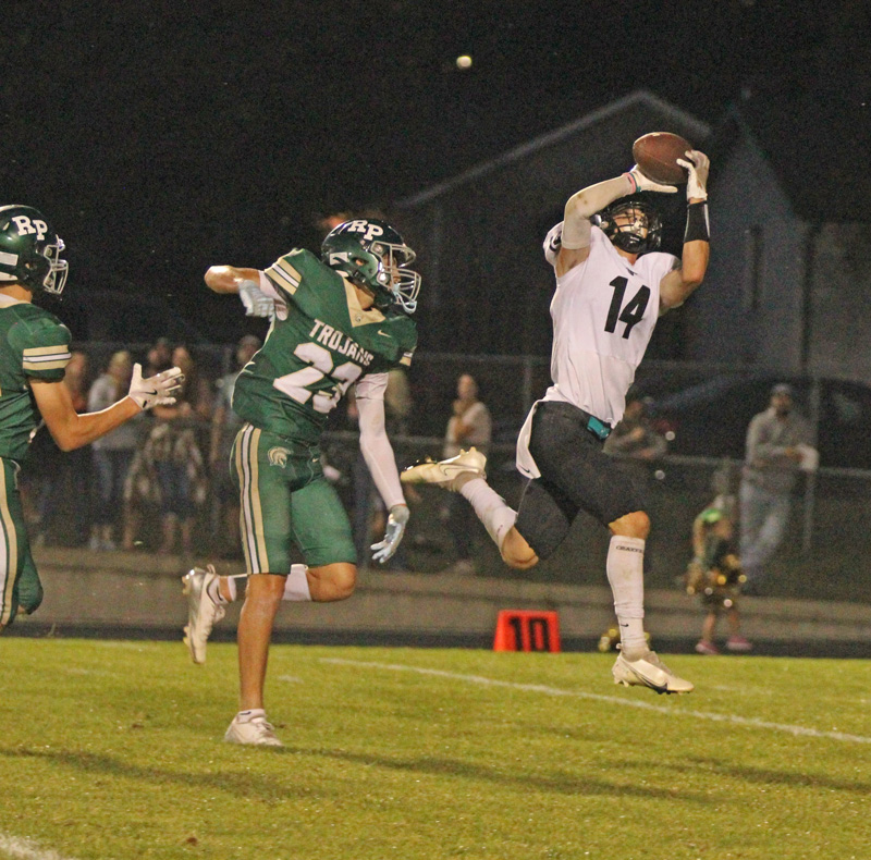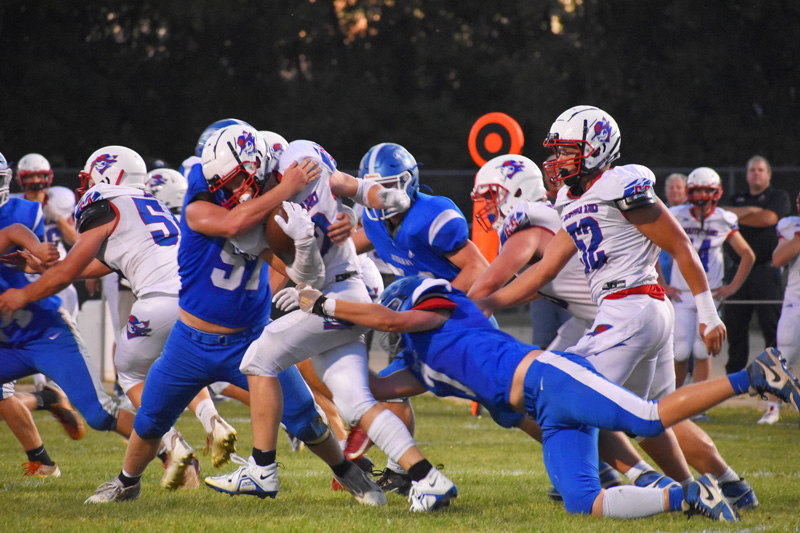 Rushford-Peterson (1-2) started its homecoming game with a big kickoff return and scored first. Fillmore Central (2-1) then scored 21 unanswered points and never trailed in posting a Mid-Southeast Blue rivalry win. Trojan Jaxson Meldahl returned the opening kick 66 yards. A Caden Johnson 25-yard pass to Domanick Corcoran and a Meldahl 1-yard TD covered the rest of the way, as R-P took its only lead, 6-0. FC answered with a 10-play scoring drive that had two fourth down conversions. A Bridon Bahl 1-yard TD run plus PAT made it 7-6. FC then scored twice in the second quarter, as Bahl hit Davis Penhollow for 43-yard TD strike. After a Trojan fumble, Anthony Kiehne capped a seven-play drive with a 7-yard TD run for a 21-6 Falcon lead. R-P scored just before the half, as Johnson found Creighton Hoiness for a 17-yard pass play. But where FC’s Atlee Hershberger was 3 of 3 on PAT’s, R-P failed each of its conversions. The Falcons led 21-12 at intermission. R-P got inside FC’s 10 in the third but turned the ball over on downs. Late in the fourth, Bahl hit Greg Kennedy for an 84-yard TD strike to cement it. The Falcons got the victory 28-12. Bahl (11-19, 255 yards, 2 TDs passing, TD rushing) accounted for three scores. Kennedy (3-134 receiving) and Penhollow (2-59 receiving) had receiving TDs. Kiehne (13-42 rushing, 3-17 receiving) had a score on the ground and two interceptions on defense. Josh Haugerud (3-45 receiving) and Kane Larson (14-44 rushing) chipped in offensive work. FC won the takeaway battle 4 to 1. Johnson (10-14, 109 yards, TD, INT passing), Meldahl (5-36 receiving; rushing TD), and Hoiness (2-31, TD receiving) led the Trojans. Meldahl had five kickoff returns for 136 yards. R-P ran for under 50 yards. FC finished with 356 total yards, R-P 200. Chris Mensink’s Falcons (3-1, 3-1) are tied with Lewiston-Altura (3-1, 3-1) atop the MSE-Blue ‘East’. Fourth-ranked Goodhue (4-0, 4-0) notably topped BP (3-1, 3-1) in other MSE “West” action. R-P fell to 1-3, 1-3.