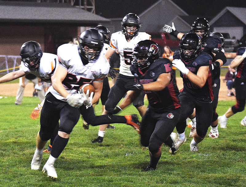 Hosting Lanesboro in South-East action, Spring Grove scored on five straight possessions, using only 11 offensive plays. Those five quick-strike TDs converted a 7-6 lead into a 42-6 margin early in the third quarter, a score that held as the final. At that point, the Lions had faced only one third down. Quarterback Bryce Berns (6 for 167 rushing) ran for two TDs on back-to-back 35 and 80-yard carries and passed (5-8, 77 yards) for two TDs. Troy Reinhardt caught a 35-yard TD toss and set up TDs with a 45-yard kickoff return and a 31-yard punt runback along with a fumble recovery and team-high nine tackles. Ben Udstuen scored with a 21-yard reception, was 6 for 6 on extra-point kicks, and averaged 40.5 yards on two punts. Dash Ranzenberger scored on TD runs of 2 and 21 yards. Lanesboro scored with a fourth-down, 4-yard pass from Mason Gilbertson (8-14, 60 yards passing) to Levi Rogers. David Harvey (20-91 rushing) and Cole Sass (14-68 rushing; 4-27 receiving) led the Burro ground game. The win kept the #8 Lions (4-0, 4-0) atop the South-East ahead of L-O/L/P (3-0, 4-0). Lanesboro fell to 0-3, 0-4.