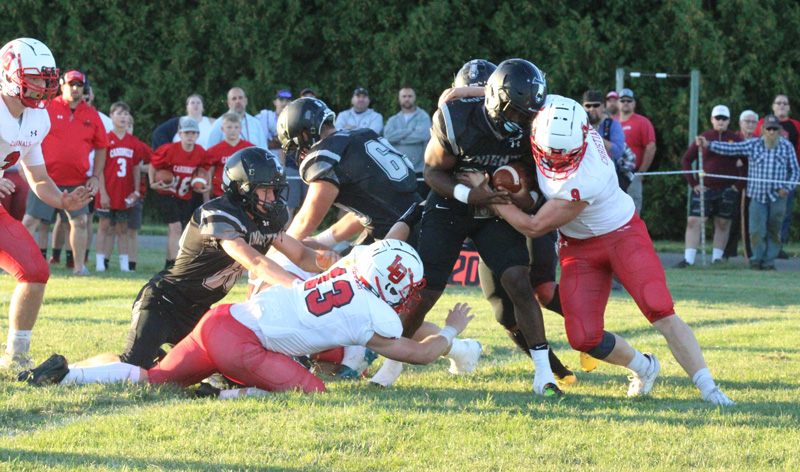 LeRoy-Ostrander/Lyle-Pacelli’s Landon Meyer (left) and Dylan Christianson (right) combine to bring down Knight quarterback Kaaleem Reiland in the teams’ big South-East season opener, a 35-26 Cardinal win. Photo by Paul Trende