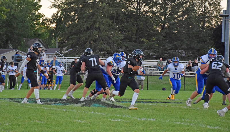 Anthony Kiehne takes the sweeping handoff from Fillmore Central quarterback Bridon Bahl