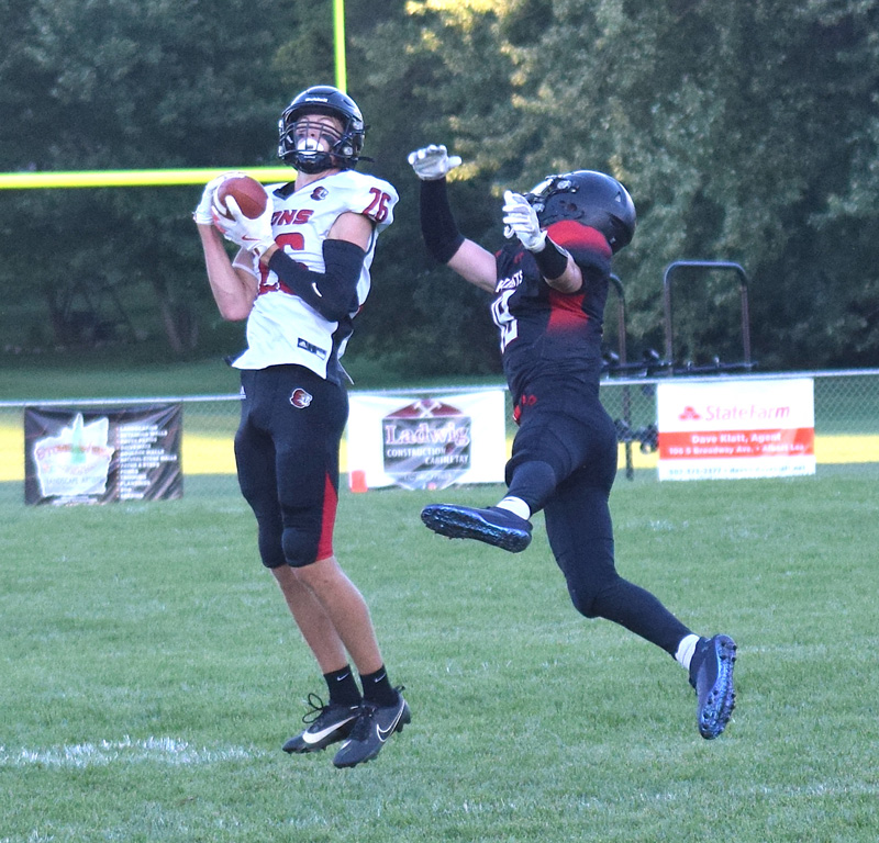 Spring Grove wide receiver Ben Udstuen catches a 51-yard pass, the longest offensive play of the game, as the Lions edged Alden-Conger/Glenville-Emmons, 20-18, in the season opener at Alden. Photo by Lee Epps