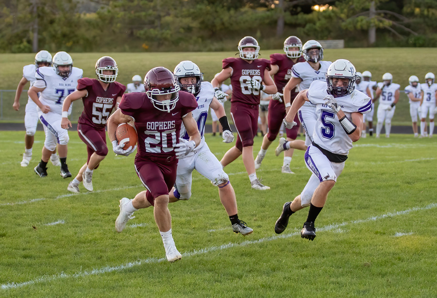Chatfield’s Ben Carrier, after a few nice cuts on a screen pass, races for a touchdown in the Gophers’ season opener versus Red Wing. The Chosen Valley guys dominated action, winning 39-7. Photo by Leif Erickson