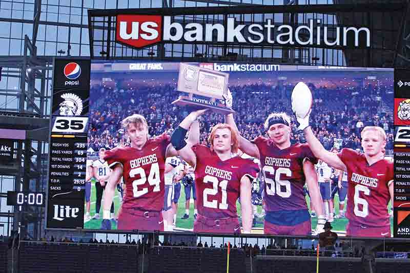 It was a great run; twenty-six straight wins. It will be remembered; back-to-back state title game visits. But Chatfield football’s hopes of a repeat title were nixed by a strong Barnesville team, an unsung Trojan player, and turnovers. The Gophers had five. And a 5 to 0 miscue margin was insurmountable, as #1 Chatfield (Section 1A Champ, 13-0) fell to #3 Barnesville (Section 8AA champion, 12-0) in the 2022 Class AA state title game. The Gophers beat the Trojans 22-18 in last year’s semis, minus star running back Sam Backer. Chatfield rallied from down 18-8, doing so on the backs of two long TD passes. Long passes in the re-match weren’t so fruitful. Barnesville scored on its second possession (key runs of 24, 44, and 13). A Dawson Gregg 2-yard TD (plus PAT) made it 7-0. But Chatfield replied in the second quarter, as Backer hit Kail Schott for a 39-yard TD pass. The Gophers fake-PAT resulted in a Luke Carrier two-point run and an 8-7 Gopher lead. It was Chatfield’s only edge. They resultantly held Barnesville to a three-and-out, but the Gophers first turnover, a Backer fumble, gave the Trojans a short field. The 34-yard drive was capped by a Zach Bredman to Tate Inniger 8-yard TD pass. The two-point run made it 15-8. That name, Inniger, will haunt the Gophers. Chatfield’s next possession ended in an interception on a throw into double coverage. Owen Riddle’s 49-yard return, plus a Gopher 15-yard penalty, set Barnesville up again. On their second play, Bredman hit Inniger, a 6’3” 260-pound blocking tight end, for 28-yard TD pass. Another conversion made it 23-8 as the half waned. But the Gophers critically drove the field. A Backer 18-yard TD run on 4th and three (0:11) made the halftime score 23-14. But turnovers plagued Chatfield in the second half too. After stopping Barnesville, Chatfield was driving. On a second and five play, Backer was again intercepted by Riddle. The Trojans then went 73 yards in 11 plays, Bredman to Inniger (9-yard TD pass) capping it. Barnesville went up 29-14. The Gophers threatened to turn up the heat. Following a fantastic 36-yard Backer run, the senior RB authored a 1-yard TD run. But Chatfield’s PAT was wide right, leaving it a two-score game at 29-20. And Barnesville replied, going 70 yards in eight plays. Included was a 15-yard scramble by back-up QB Gannon Bolgrean on 4th and 11. Inniger then capped the series with a one-yard TD plunge. It was his fifth offensive touch, his fourth TD. With 4:14 left, B-ville led 35-20.