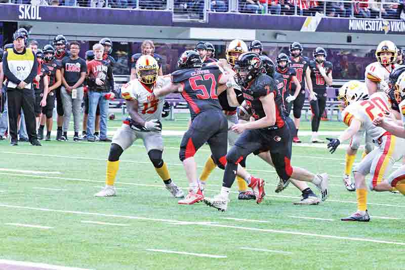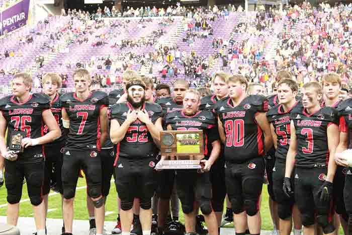 For MIB, Asher Zubich passed for 157 yards (11 for 22, 2 TD) and rushed for 129 (28 carries). On the game’s first possession, Solum completed five of seven passes before scoring on foot from the five yard-line. Four plays later, Solum forced a fumble recovered by Noah Blackburn. On the next play, Solum hit a wide-open Tysen Grinde (6 catches, 102 yards) with a 43-yard TD pass for a 13-0 lead. When MIB fumbled a punt return, Brandon Jahnke recovered at the Ranger 20. Two plays later, Hunter Holland (12 carries, 74 yards) broke several tackles while running 14 yards to the end zone making it 19-0. SG had added two touchdowns with only three offensive plays. But after scoring on three of their first four possessions, the Lions scored on only one of their final 10. Their fourth TD came with only two plays after recovering a fumble at the Ranger 24. Solum scored on a 12-yard run to create a little breathing room, 25-14. But SG’s next possession ended on downs at MIB 37. One play later, Zubich passed 63 yards to Riley Busch and suddenly, it was 25-20. Two late MIB threats were both foiled both by Jaxon Strinmoen, who first broke up a fourth-down pass, then ended the next threat with an interception at the goal line (6:25). But the Lion offense would not be able to run out the clock or stop the Rangers on their game-clinching drive. The Lions averaged 5.1 yards per play and the Rangers 4.6. Overall, MIB outgained SG by only 50 yards (378 to 328), but when the Rangers did not have turnovers, they converted on 9 of 13 third downs. SG was 3 for 11. The MIB pass defense, after giving up the early long TD toss, finished with two interceptions and 10 pass break-ups. Each team gave up only two big-yardage plays. The Lions “D” featured Solum (17 tackles), Jacob Olerud (12) and Grinde (8). Strinmoen and Caleb Griffin had interceptions. Tapio (18-97, 2 TDs rushing) joined Zubich in doing big damage for MIB. SG closed at 13-1, a drastic turn-around after going 3-5 a season ago. Lion seniors are Grinde, Griffin, Holland, Blackburn, Ty Cleven, Logan Brumm, and Cooper Olson. MIB (13-0) won their first state title since 1972.